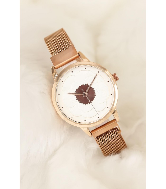 Mıknatıslı Hasır Metal Rose Renk Kordonlu Desenli İç Tasarımlı Bayan Saat