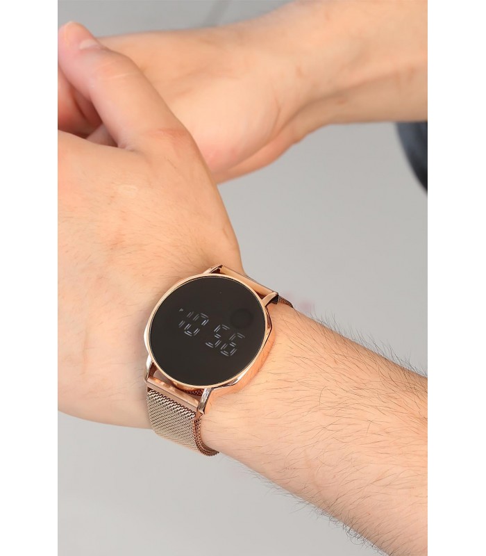 Rose Renk Hasır Metal Kordonlu Dijital Erkek Kol Saati