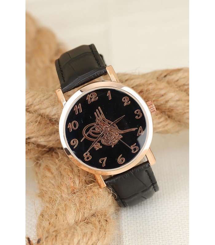 Siyah Deri Kordonlu Rose Renk Metal Kasa Osmanlı Tuğralı Erkek Saat