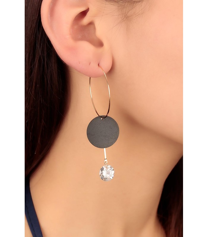 Mat siyah renk yuvarlak aksesuarlı kristal taşlı sallantı model Trend Bayan Metal Küpe